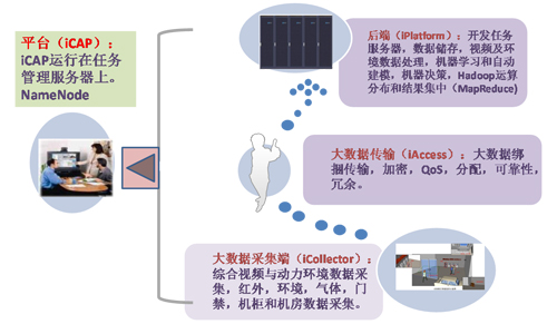 具体在大数据采集端,根据实际需求,提供集综合视频与动力环境采集于一体的、可以分布式部署的综合采集设备,以完成各类综合信息的有效提取。同时,也将根据架构的需求,在设备方面赋予一定的智能分析功能。综合采集设备所提取、处理的各类信息,将通过一线(大数据传输),在保证安全可靠的情况下完成大数据混合处理,传输到后端。在后端,对海量数据开展汇聚、分类、管理、加工等工作。最后,通过iCAP平台,为各类用户提供满足信息、结论、及时、简单、智能五大核心需求的服务。